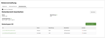 Sie können pro Jahrgangsstufe festlegen, welche Skala verwendet wird. Notenbereiche (z.B. Großer LNW, Kleiner LNW) und Notenarten (z.B. Klausur, Kurztest, Mündlich) definieren Sie frei, mit individueller Gewichtung.