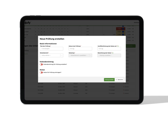 Erstellen Sie Prüfungen mit Titel, Datum, Notenbereich und Gewichtung. Prüfungen werden automatisch mit dem Schulkalender verknüpft, sodass alle Beteiligten die Termine im Blick haben.