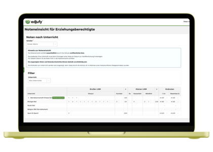 Erziehungsberechtigte und Schüler:innen können freigegebene Noten jederzeit online einsehen. Übersichtlich nach Fächern gegliedert, mit Durchschnitten pro Notenbereich und Endnoten pro Halbjahr und Schuljahr.